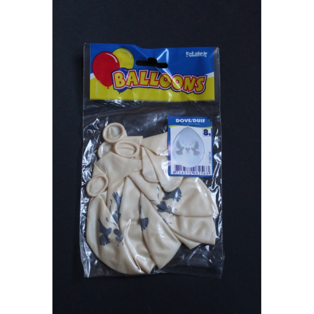 Een zakje met 8 witte ballonnen met daarop 2 duifjes en een hartje.