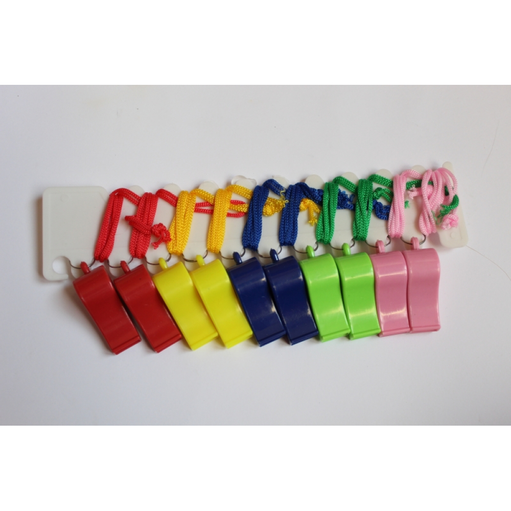 Diverse kleuren scheidrechter fluitjes aan een koortje.