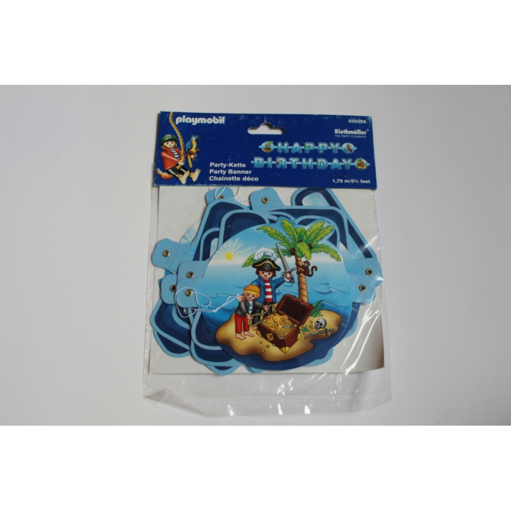 Een letterslinger van playmobil piraat met de tekst happy birthday erop.