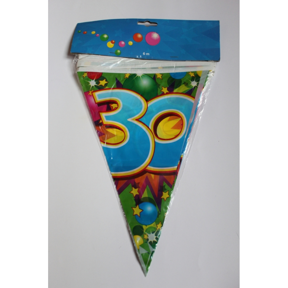 Een vlaggenlijn van 6 meter lang met het cijfer 30 erop,in vrolijke kleuren.