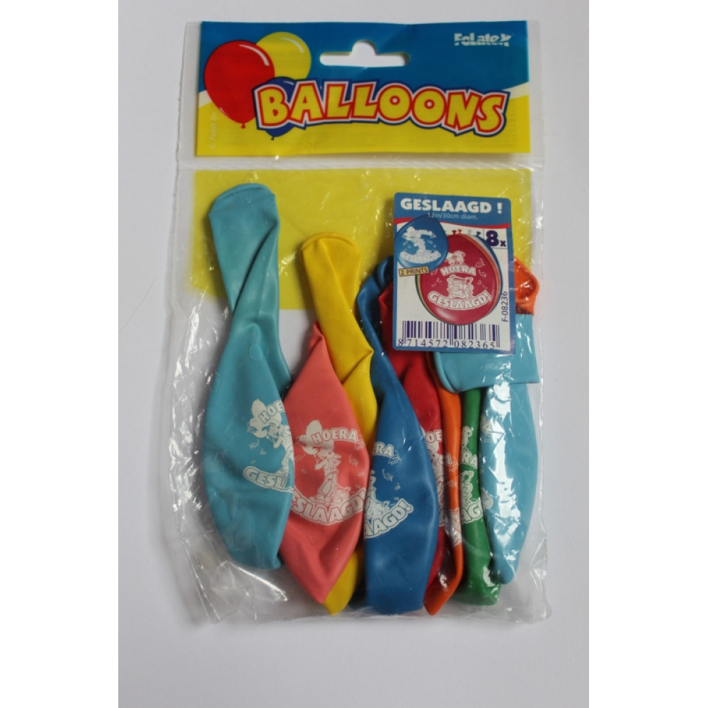 Een zakje met 8 ballonnen in diverse kleuren met Hoera geslaagd erop.