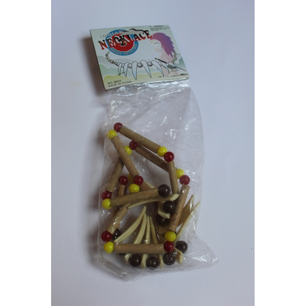 Een zakje met daarin een houten indianen ketting, aan de onderkant zitten tanden, tussen de houtenkralen zitten ook gekleurde kralen elke ketting kan daardoor anders zijn.