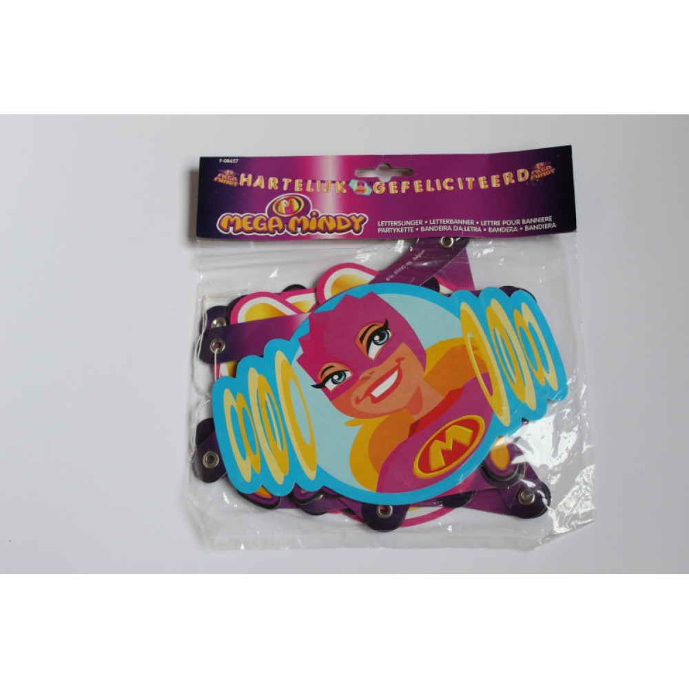 Een letterslinger van Mega Mindy, met een M, de naam: Mega MIndy en Hartelijk Gefeliciteerdin het midden nog een afbeelding van Mega Mindy.