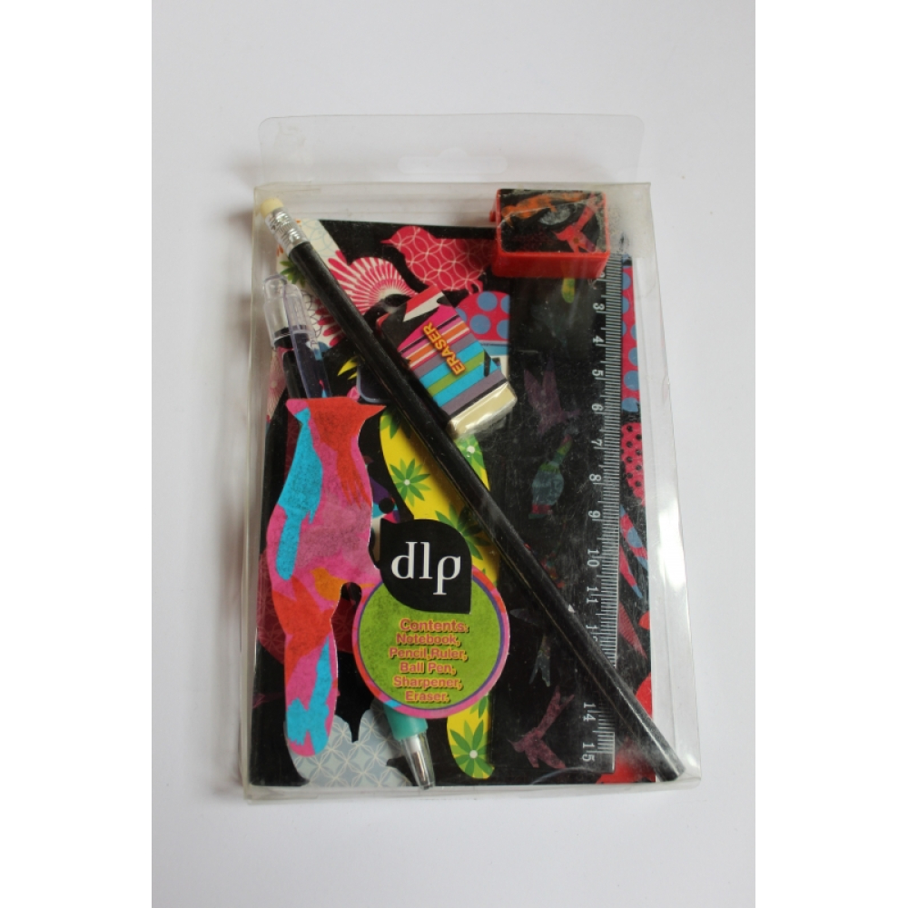 Een 6 delig schrijfsetje in de verpakking.