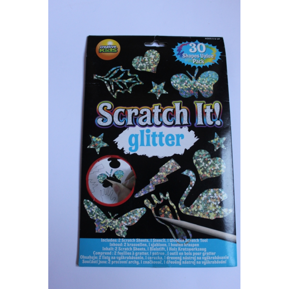 Scratch it. Een pakje met 2 vellen en 1 dieren, vormen vel en een stokje om te scratchen. Het is een glitter pakketje dus er komen mooie glitter figuren onderuit. Voor kinderen vanaf 8 jaar