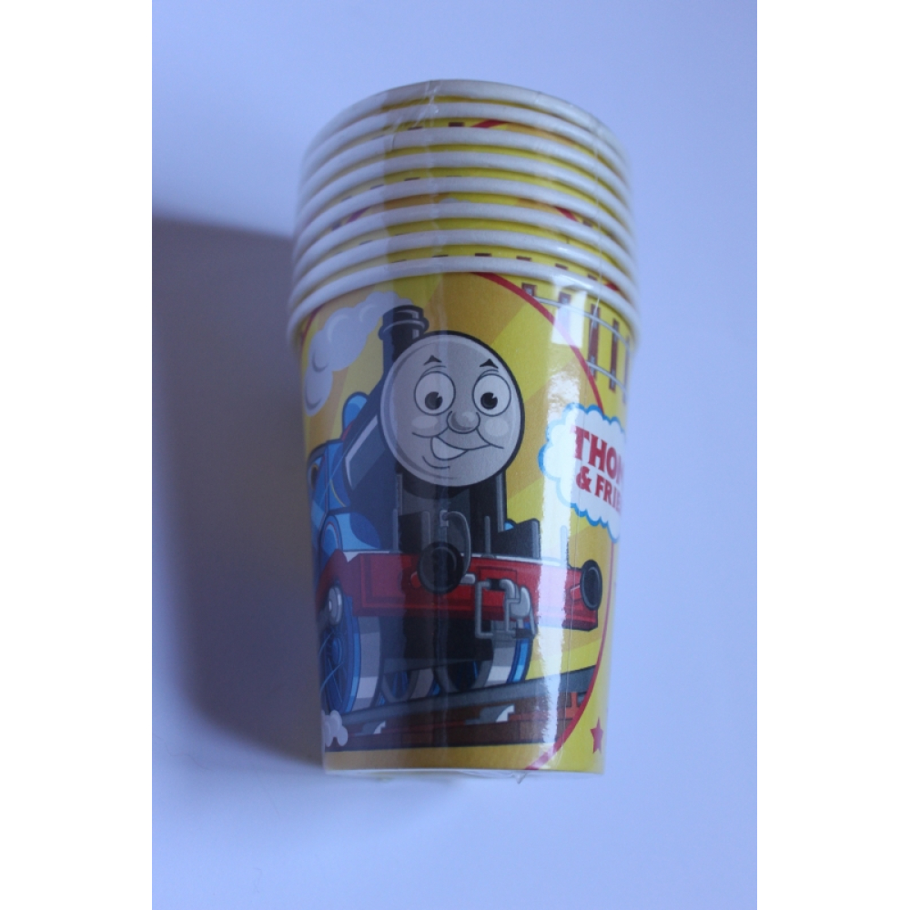 Leuke vrolijke bekers van Thomas trein. De bekers zijn geel van kleur en aan de bovenrand is een treinrails afgebeeld, in het midden staat een grote afbeelding van Thomas trein. Er zitten 8 bekers in de verpakking.