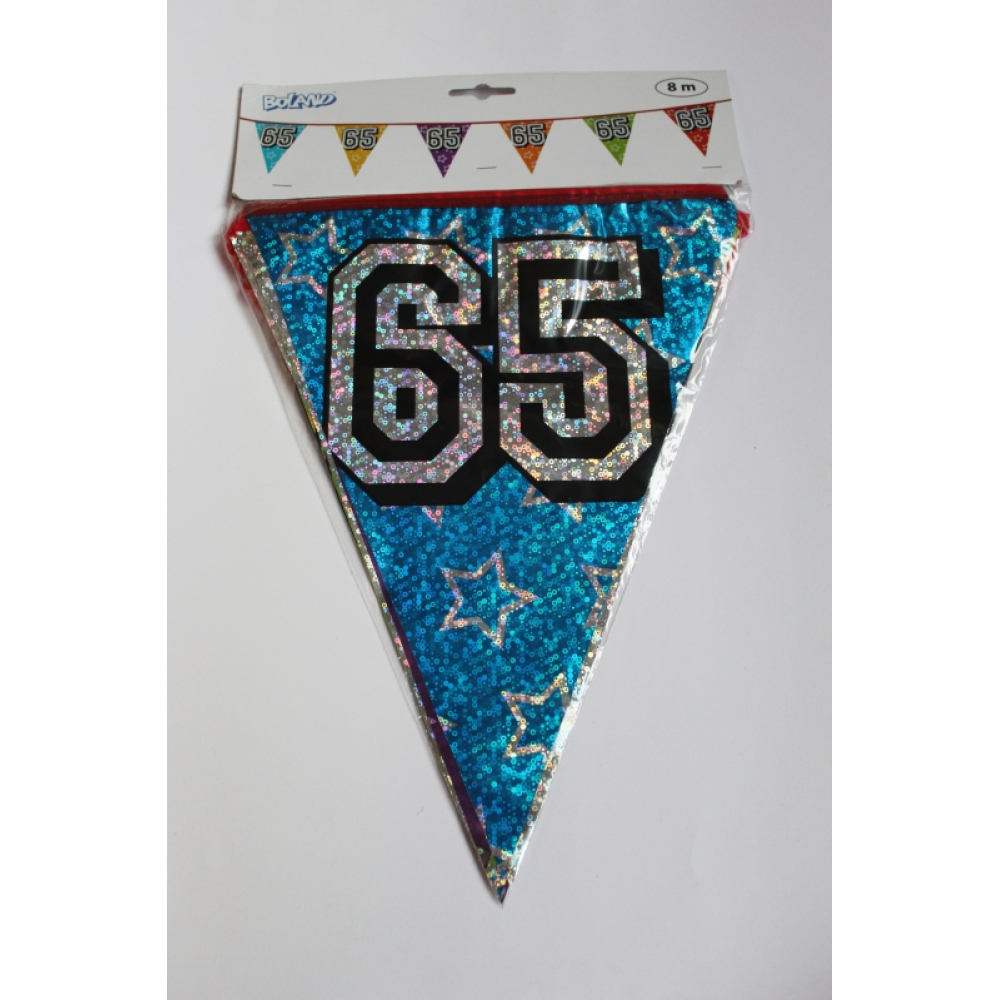 Een vlaggenlijn van 8 meter lang met het cijfer 65 erop,in vrolijke glitter kleuren.