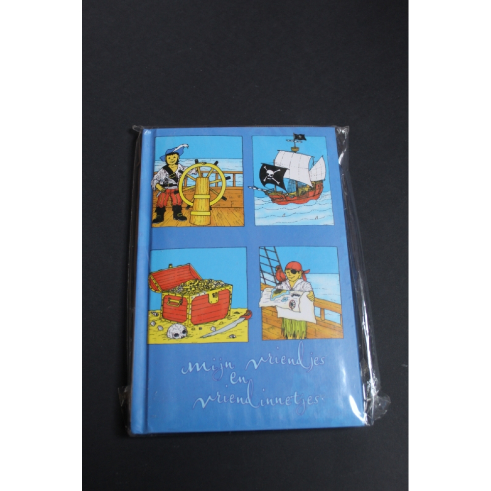Een blauw vriendenboekje met diverse plaatjes van piraten erop om alle vriendjes en vriendinnetjes in te laten schrijven over wie ze zijn, waar ze wonen, wat ze het liefst eten, doen, lezen, en nog veel meer.