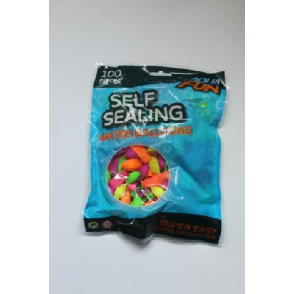 Zak met 100 water ballonnen, de ballonnen kunnen gevuld worden met water via de kraan, er zit een kraanstukje bij die je op de kraan kunt aansluiten en die heeft een tuitje waar de ballonnen aan kunnen. De ballonnen sluiten zich zelf als ze gevuld zijn, dus geen knoopje of iets nodig.