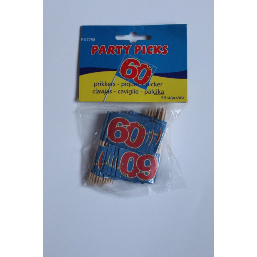 Pakje met 50 prikkertjes met op de vlaggetjes "60" erop.