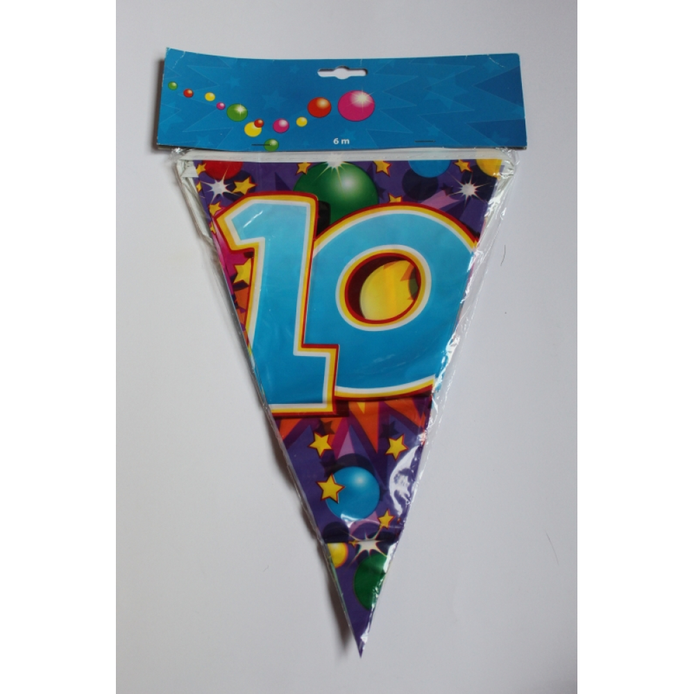 Een vlaggenlijn van 6 meter lang met het cijfer 10 erop,in vrolijke kleuren.