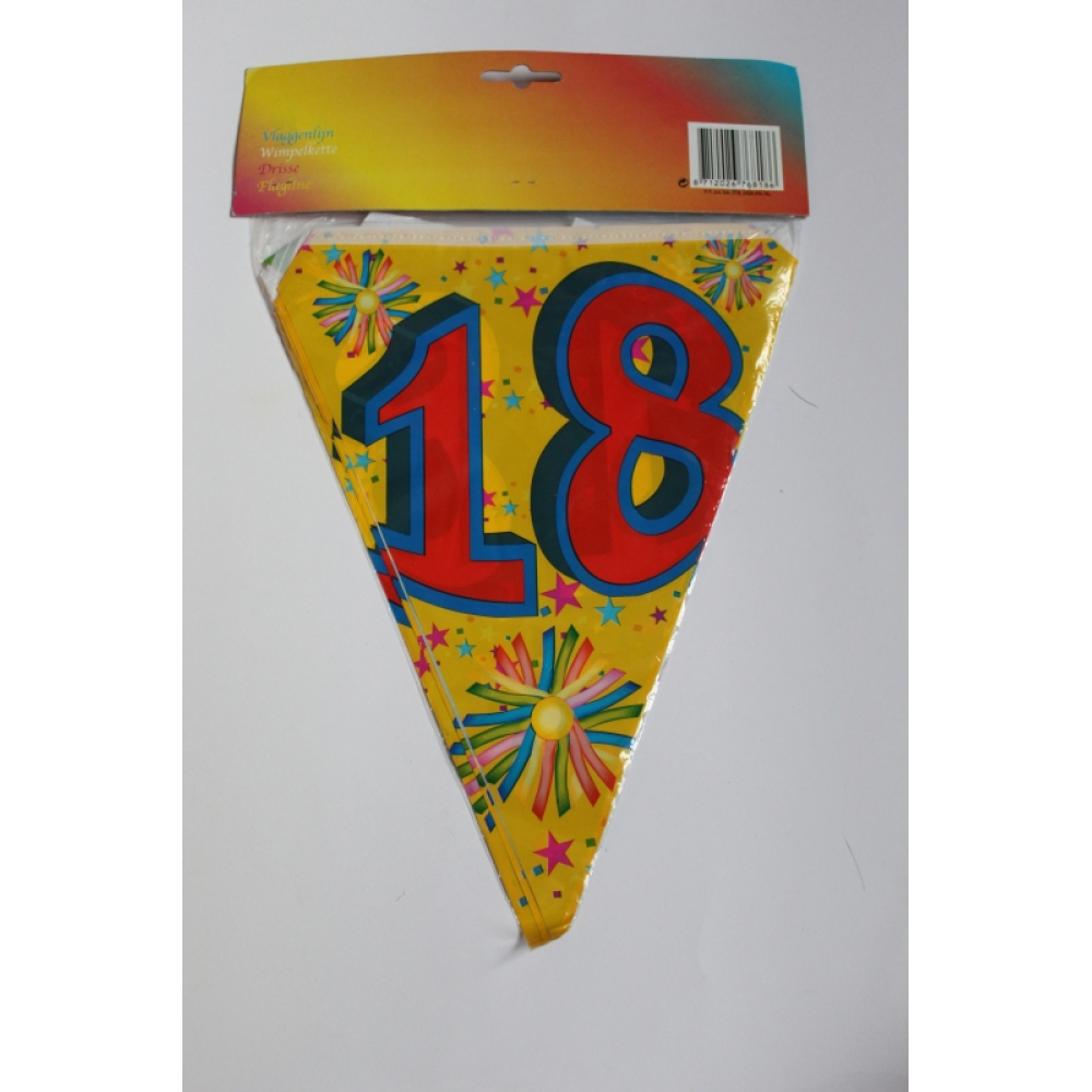 Een vlaggenlijn van 6 meter lang met het cijfer 18 erop,in vrolijke kleuren.