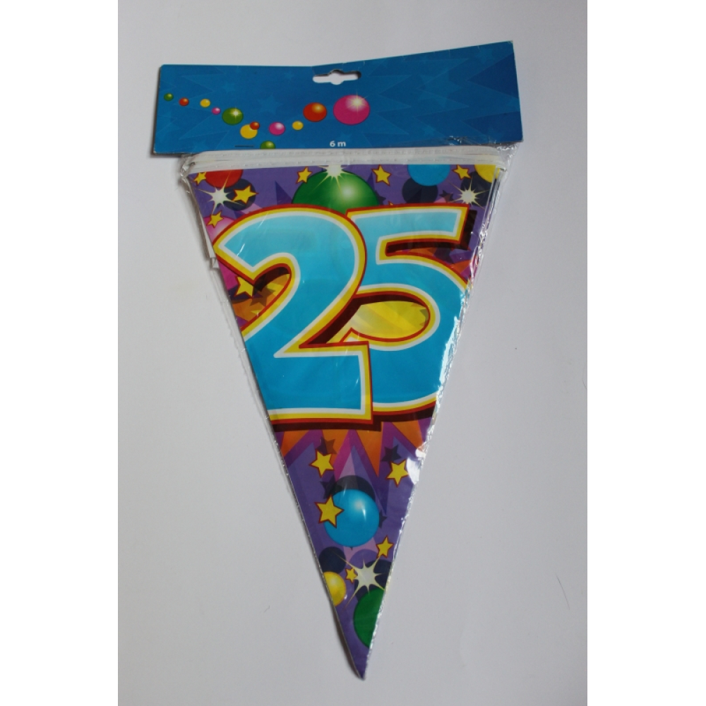 Een vlaggenlijn van 6 meter lang met het cijfer 25 erop,in vrolijke kleuren.