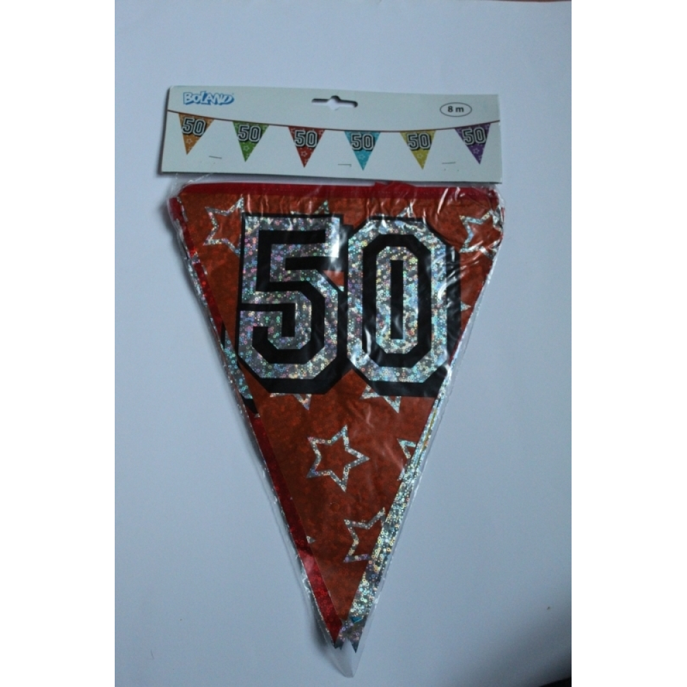 Een vlaggenlijn met 50 erop die gezellig glittert met diverse kleuren vlaggen.