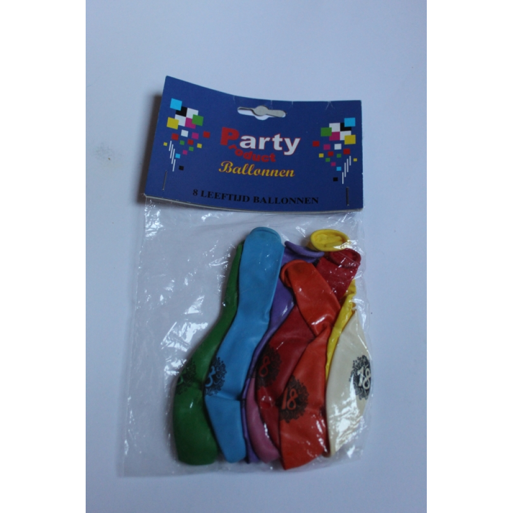 Een zakje met 8 ballonnen in diverse kleuren met daarop het cijfer 18 aan de voorkant, aan de achterkant de afbeelding van een jongen/meisje in auto met hun papiertje(rijbewijs).