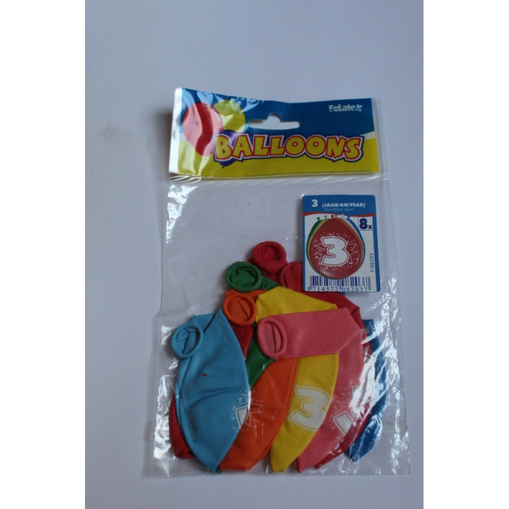 Zakje met 8 ballonnen in diverse kleuren met 3 jaar erop.