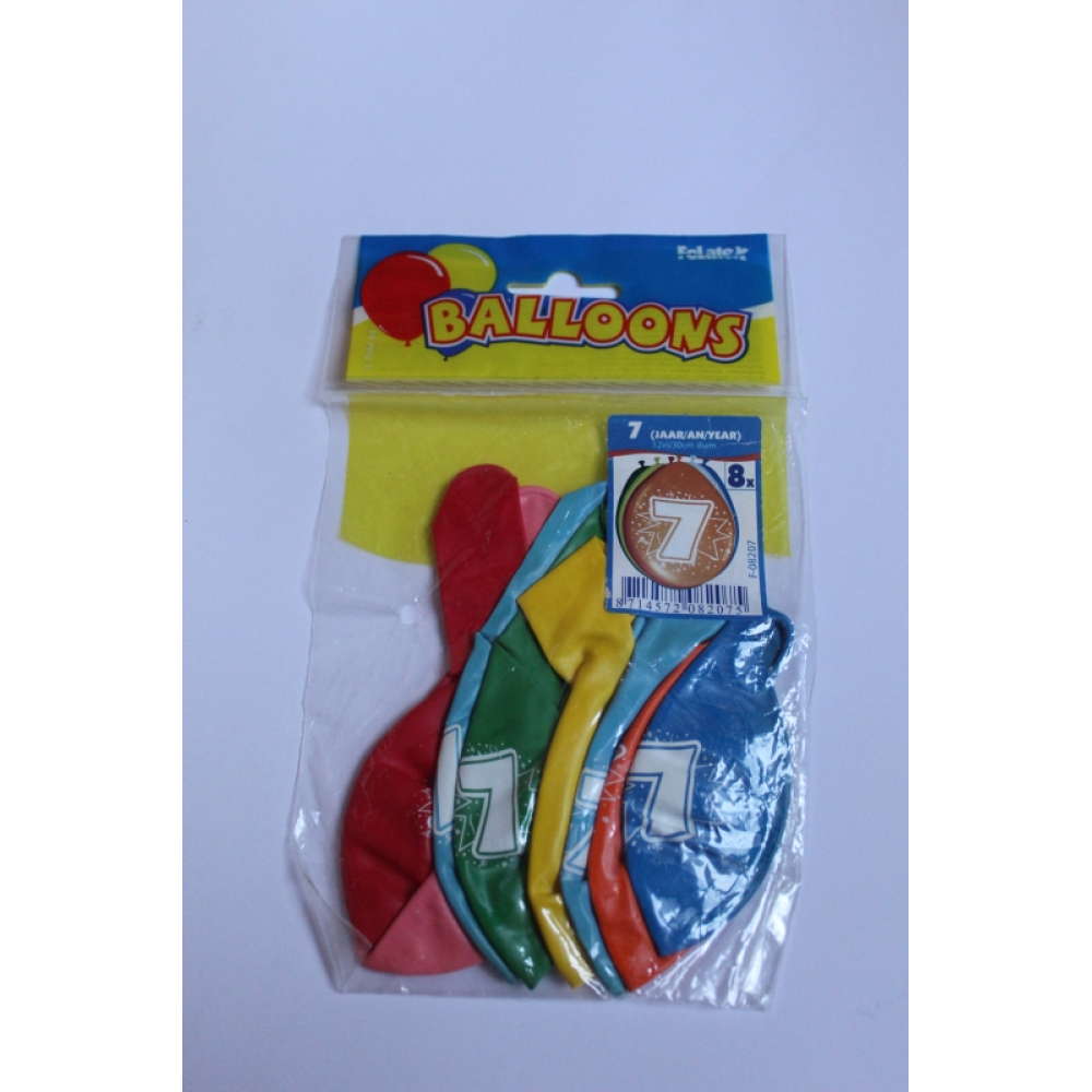 Zakje met 8 ballonnen in diverse kleuren en met de leeftijd 7 jaar erop.