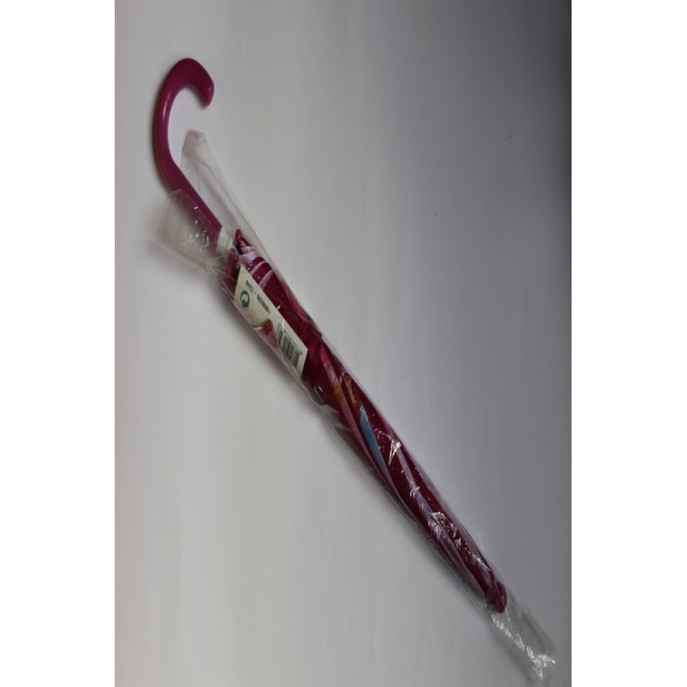 Een donker roze met licht roze paraplu met 4 disney prinsessen erop, Doornroosje, belle, ariel, assepoester.