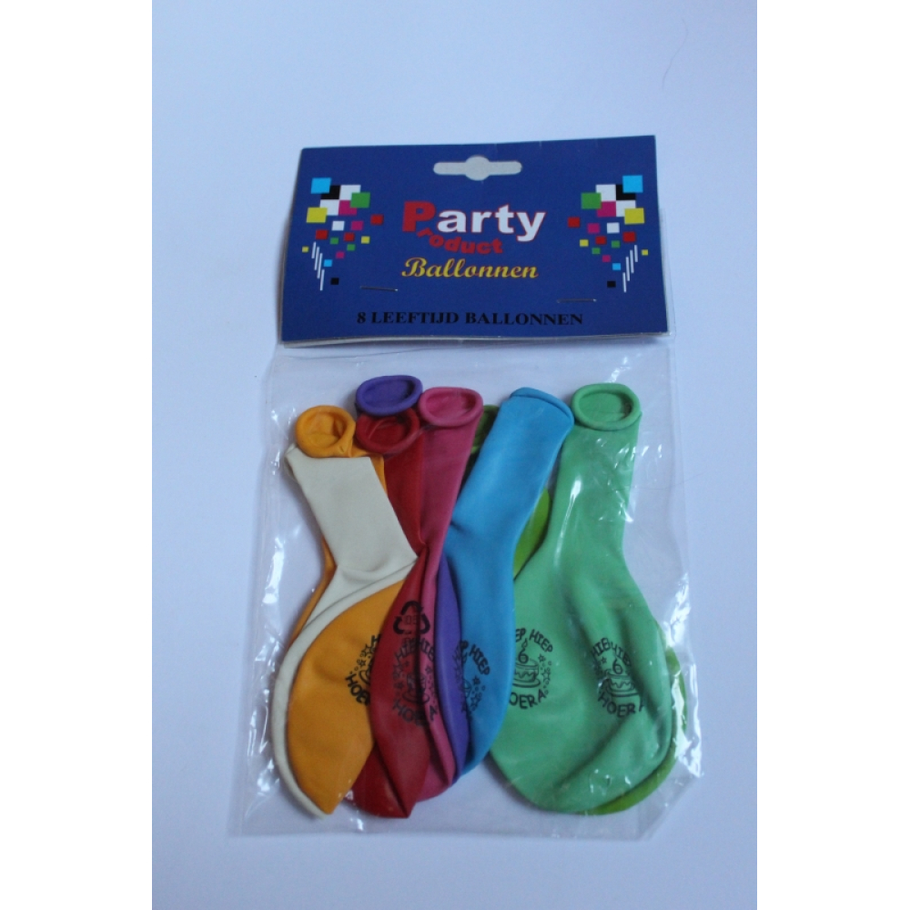 Een zakje met 8 ballonnen in diverse kleuren met de tekst erop Hoera 6 jaar.