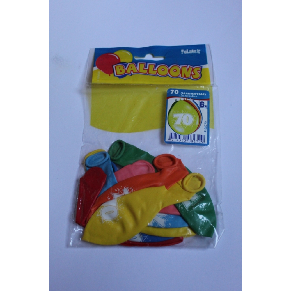Zakje van 8 ballonnen in diverse kleuren en met de leeftijd 70 jaar erop.