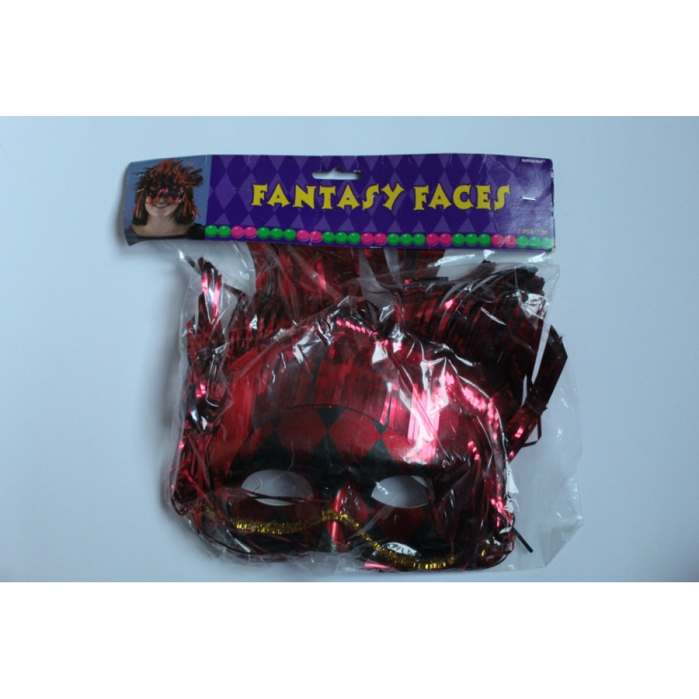 Het masker is rood en heeft zwarte ruiten.
