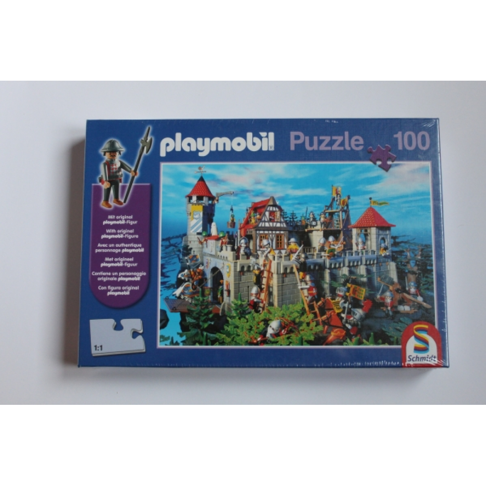 Deze puzzel heeft 100 stukjes en heeft de afbeelding van het ridderkasteel wat wordt aangevallen.
