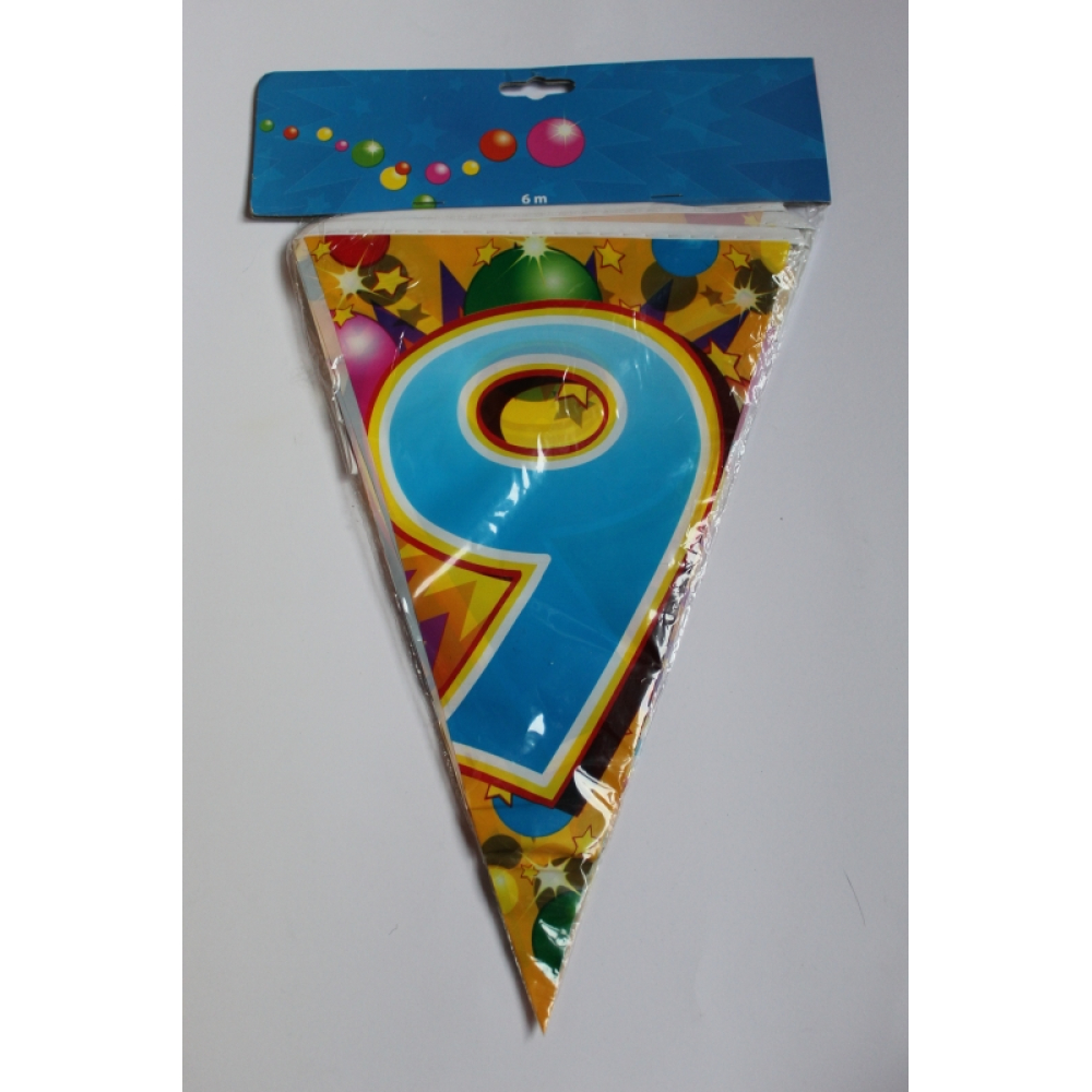 Een vlaggenlijn van 6 meter lang met het cijfer 9 erop,in vrolijke kleuren.